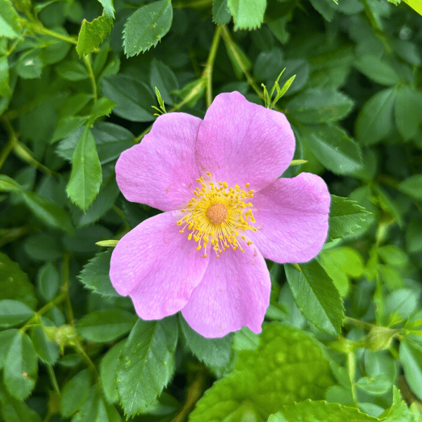 Carolina Rose, also known as pasture rose, is a low-growing native deciduous shrub that brings multi-season beauty and essential habitat to your landscape. In early summer, it produces an abundance of fragrant, bright pink flowers with yellow centers that attract bees and butterflies. After the flowers fade, they mature into showy red hips that provide a crucial food source for songbirds, quail, and small mammals in fall and winter.