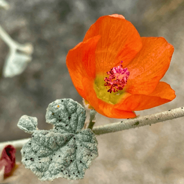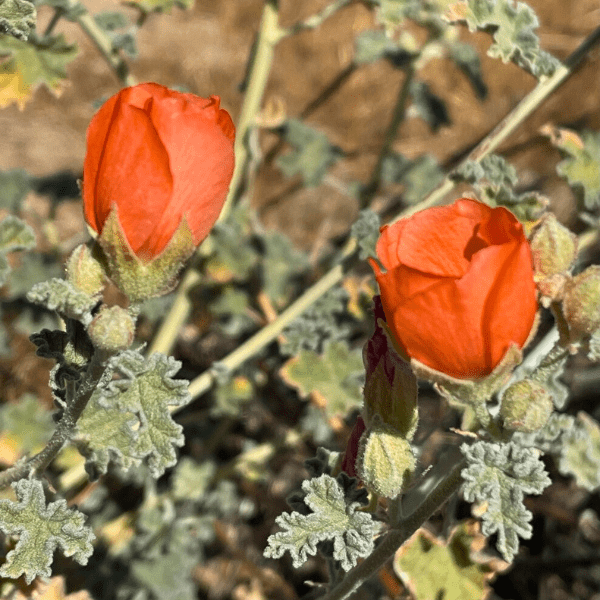 Desert Globemallow (Sphaeralcea ambigua), also known as Apricot Mallow, is a striking perennial shrub that brings a spectacular burst of color to arid landscapes. Native to creosote bush scrub and desert chaparral habitats across the Southwest, this shrubby, woolly plant grows 3-5 feet tall. It features fuzzy, whitish-green leaves with rounded, scalloped edges and weak, wide-ranging stems that give it a loose, informal habit.