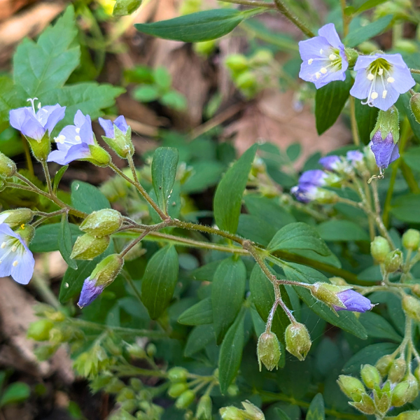 Add early-season beauty and vital pollinator support to your shade garden with Jacob’s Ladder (Polemonium reptans), a native perennial known for its clusters of lovely violet-blue, bell-shaped flowers and distinctive fern-like foliage. This charming woodland wildflower blooms for several weeks in April and May, providing one of the first nectar and pollen sources for emerging bees and other spring pollinators.